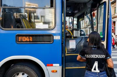 Porto Alegre, RS, 05/07/2022: Torcedores embarcam na linha de ônibus especial F993 FUTEBOL BEIRA-RIO, com saída no Largo Glênio Peres em direção ao estádio Beira-Rio, duas horas antes do início da partida. Além desta, mais de 20 linhas regulares do transporte coletivo, entre lotações e ônibus, atendem a região do Beira-Rio pela av. Padre Cacique. Foto: Alex Rocha/PMPA