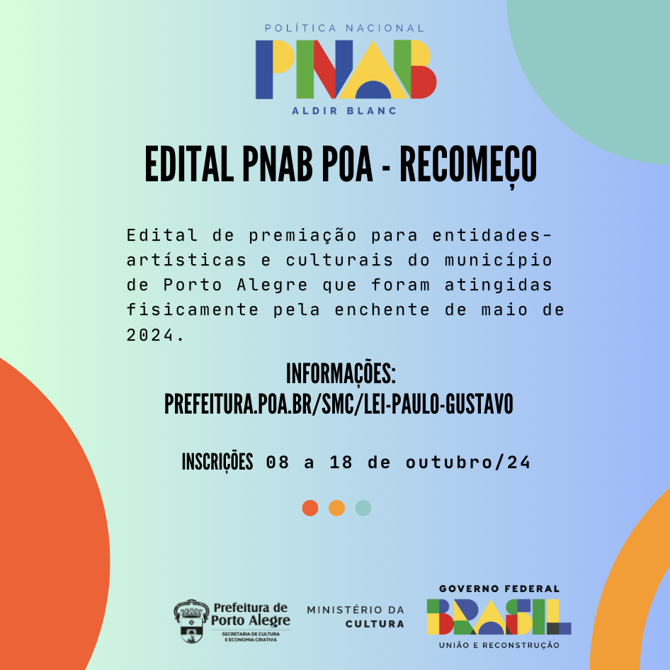 O objeto do Edital PNAB POA - RECOMEÇO é a premiação de iniciativas pré-existentes, por suas trajetórias no processo contribuição ao cenário cultural de Porto Alegre, apresentada e realizada pelas entidades-artísticas e culturais do município que foram atingidos fisicamente pela enchente de maio de 2024, com sede das atividades no território considerado pelo mapa da enchente, https://prefeitura.poa.br/inundacoes ou ainda que, a partir de suas características do fazer cultural serem essencialmente no formato de itinerância, tenham sofrido perdas materiais a partir de alagamento em local de realização de suas atividades culturais e artísticas. Importante salientar que os contemplados poderão também concorrer no edital de fomento que será lançado no decorrer da execução da PNAB 2024, não havendo vedação neste sentido.