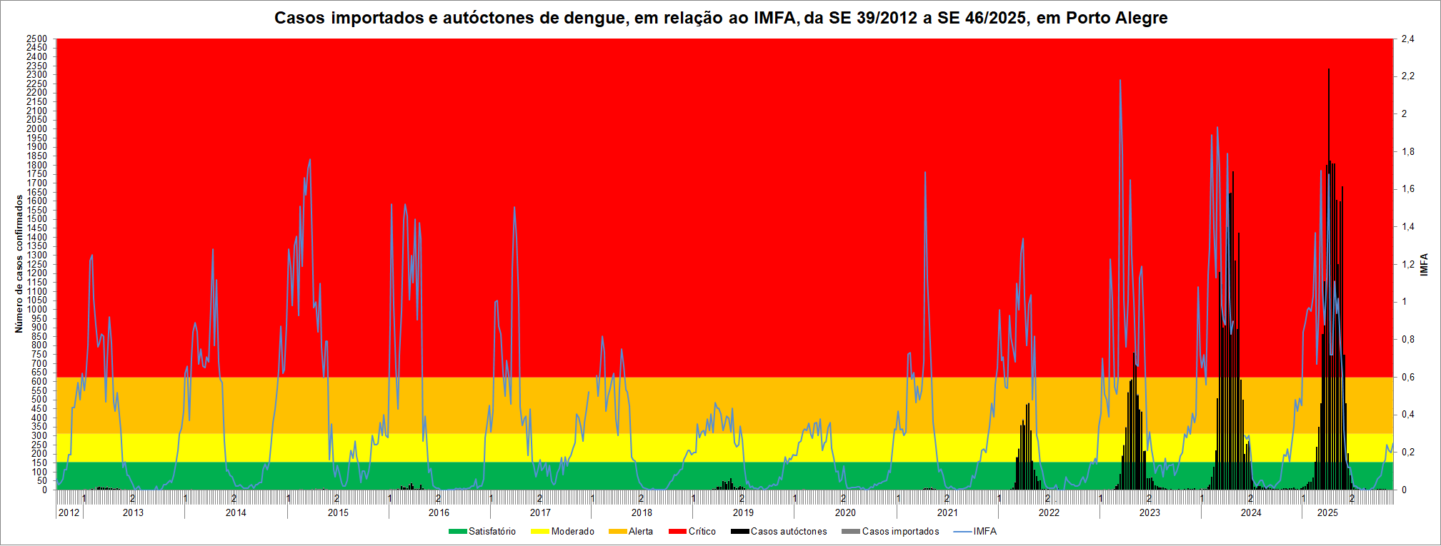 O Gráfico mostra o padrão sazonal de ocorrência de casos importados e autóctones de dengue em Porto Alegre no período da Semana Epidemiológica (SE) 39/2012 a SE 46/2025. Estes valores estão contrastados com o Índice Médio de Fêmeas de Aedes aegypti (IMFA) que representa o tamanho populacional do vetor e é dividido em diferentes níveis para executar ações de combate a arboviroses. Neste recorte temporal, é mostrado que 98% dos casos de dengue ocorreram nos períodos de IMFA em nível alerta (superior a 0,3 e inferior a 0,6) e crítico (superior a 0,6).